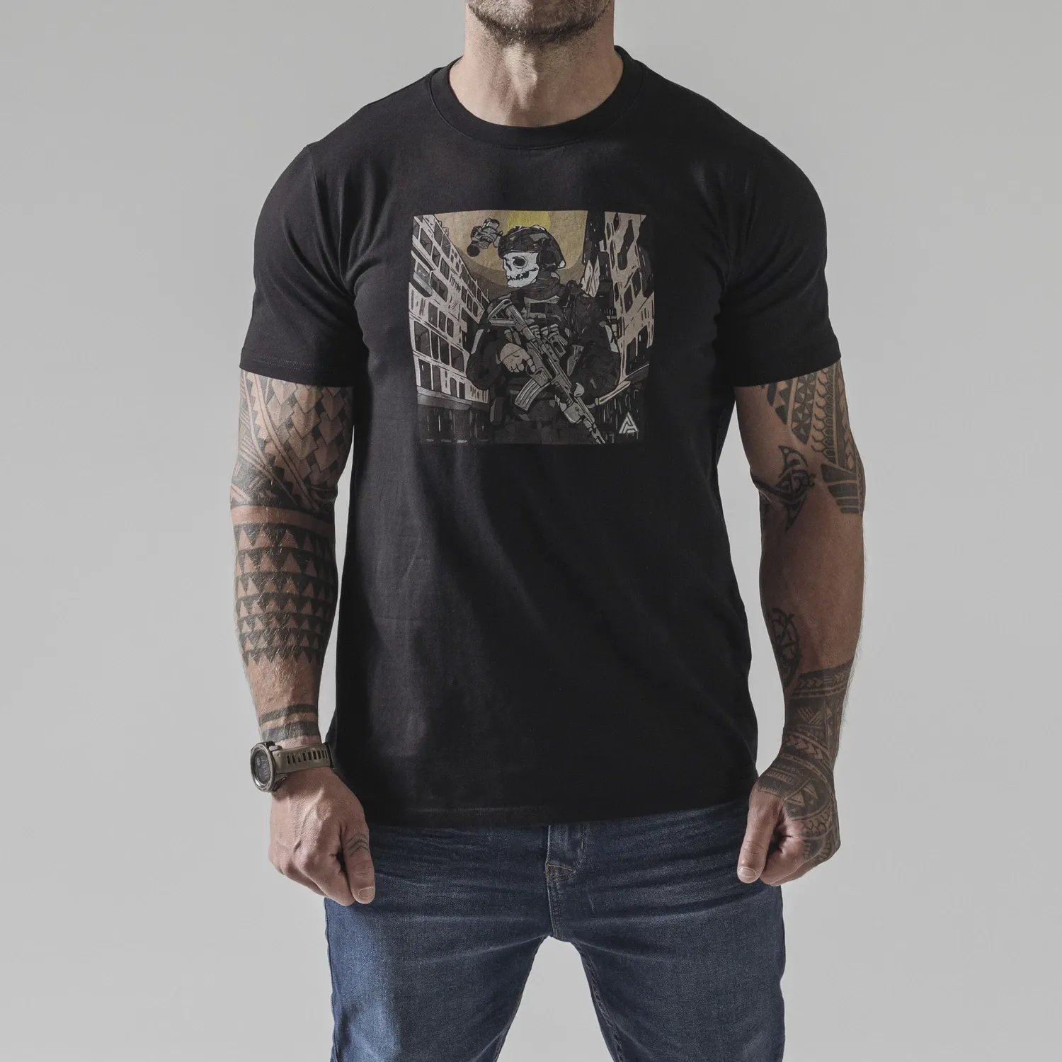 Футболка DA Skeleton воплощает смелый уличный стиль с тактическим уклоном. Готовый к бою скелет на фоне разрушенного города создает постапокалиптическую атмосферу с мрачной эстетикой - идеально подходит для стрельбища, тренировок или повседневных операций.