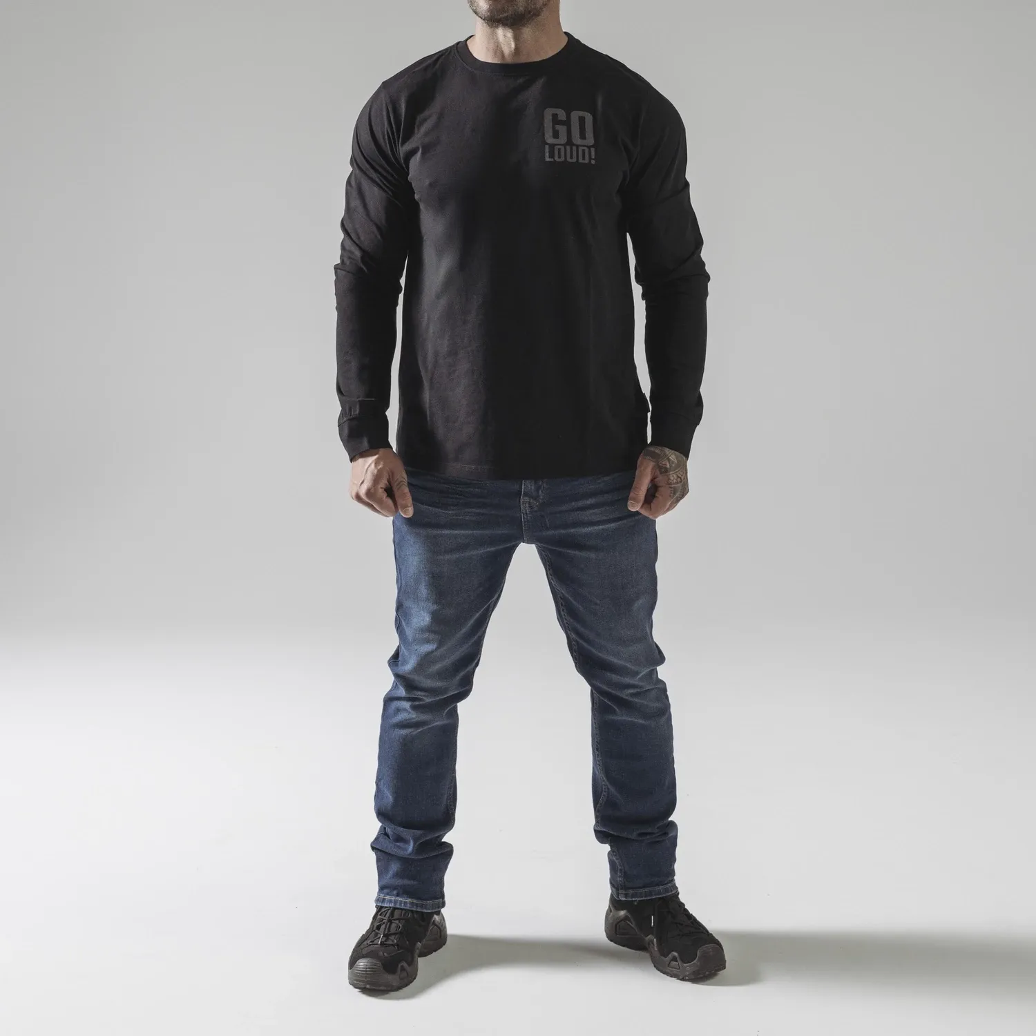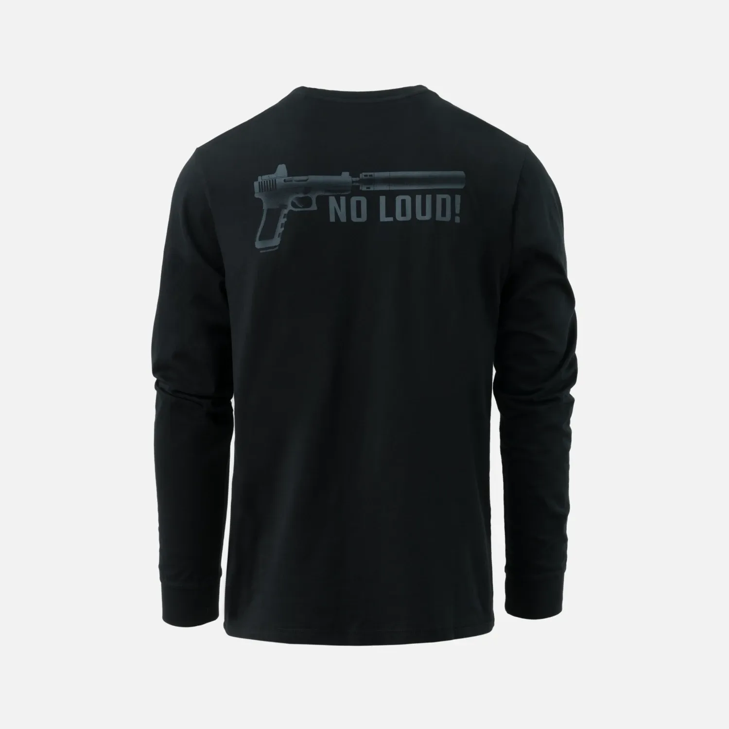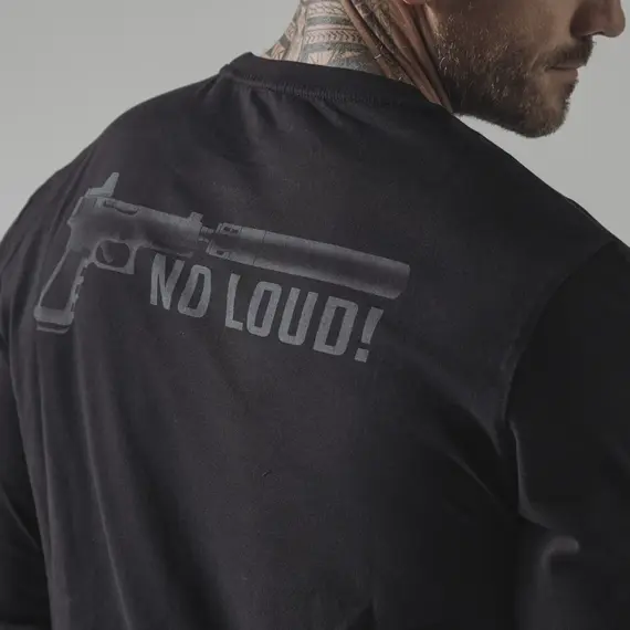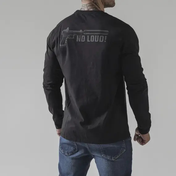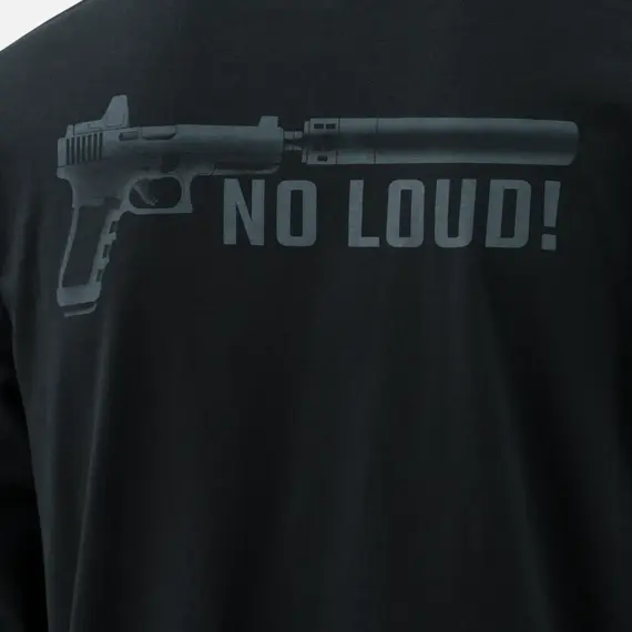 Длинный рукав с пистолетом с глушителем и надписью "Без шума!" на черном фоне.