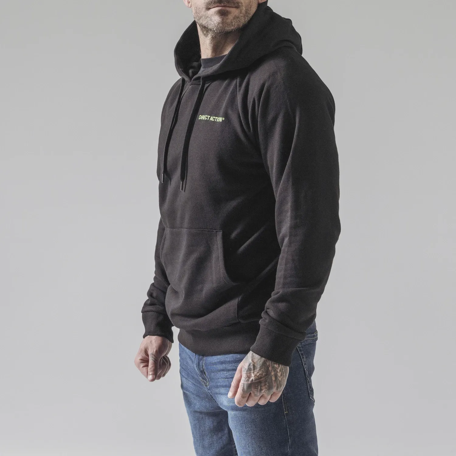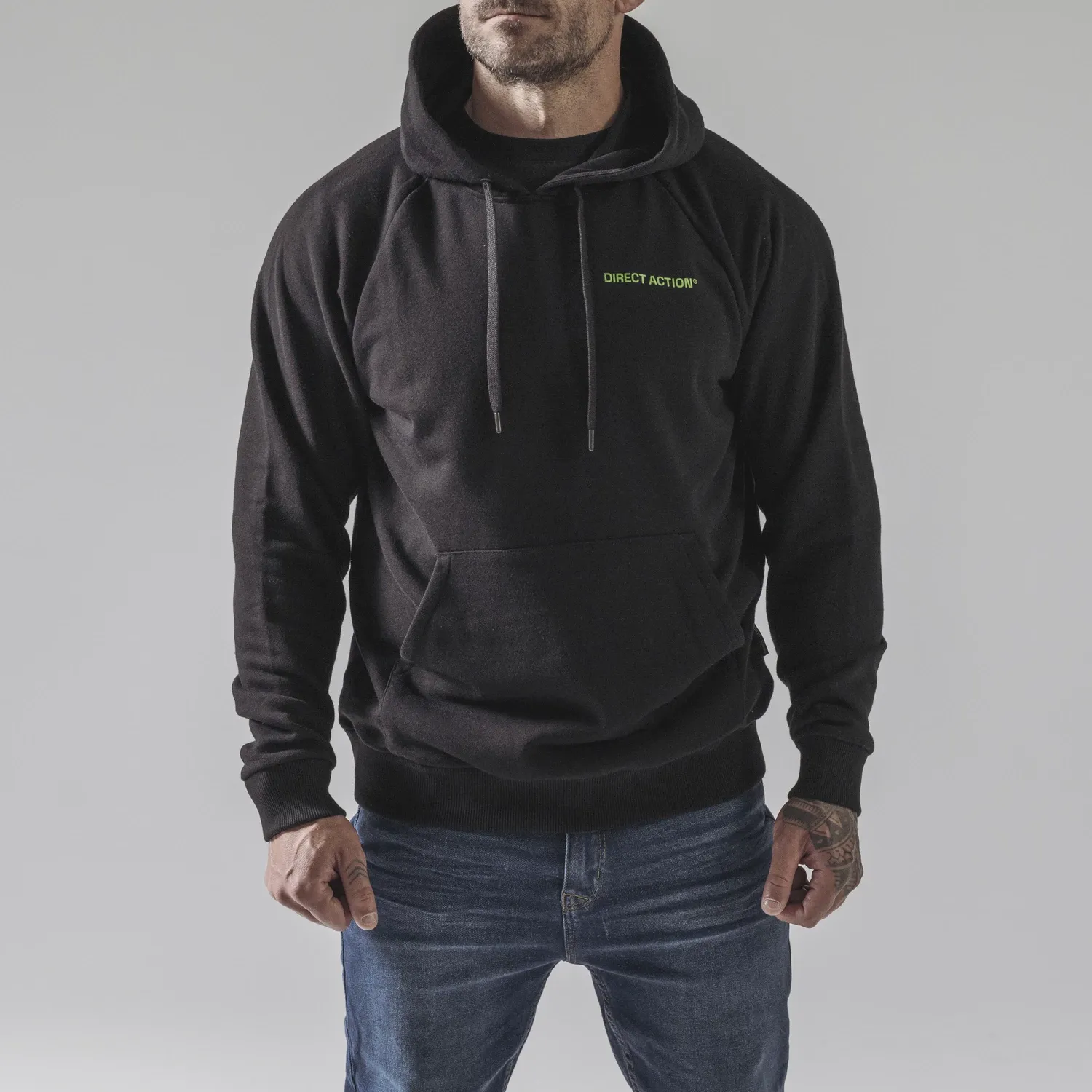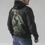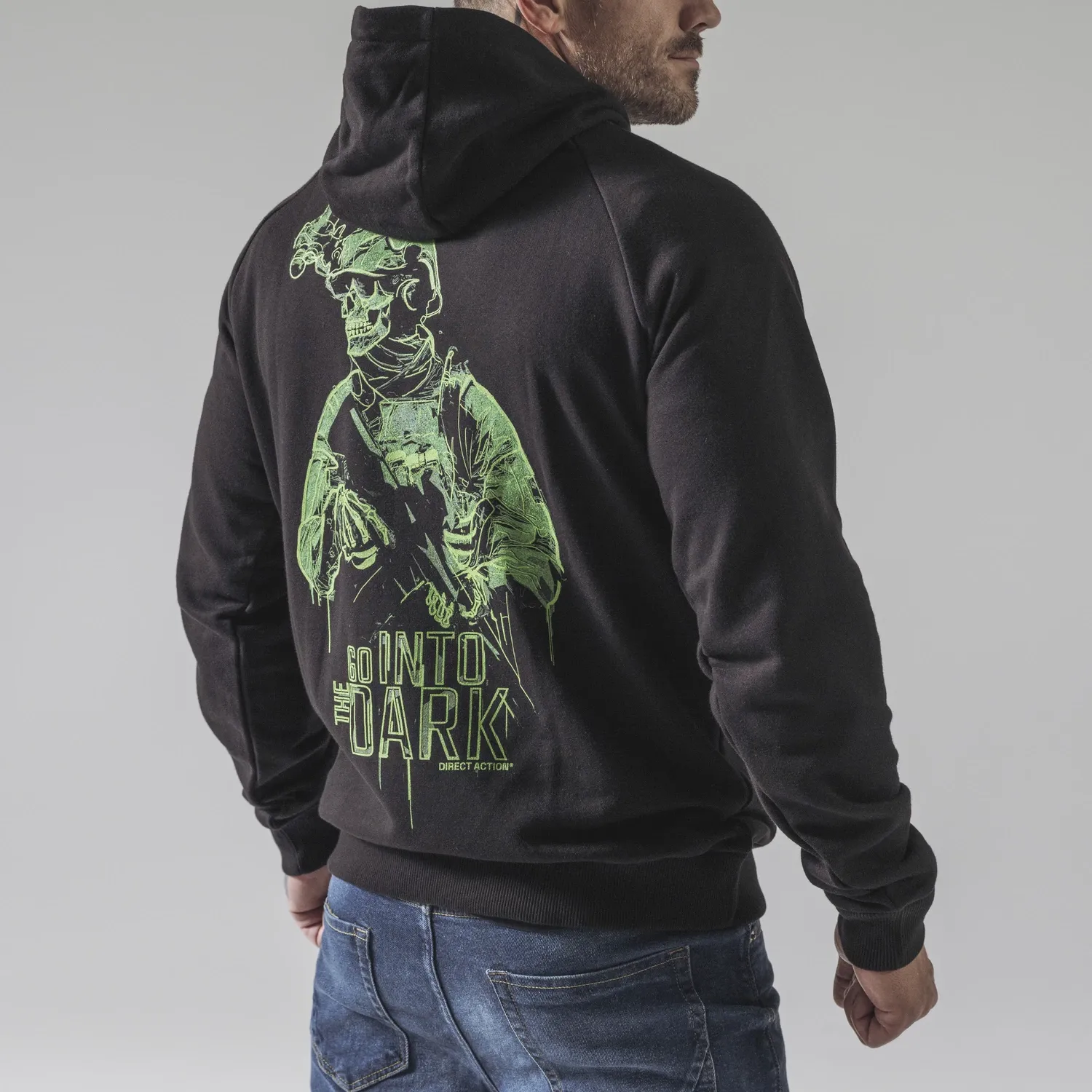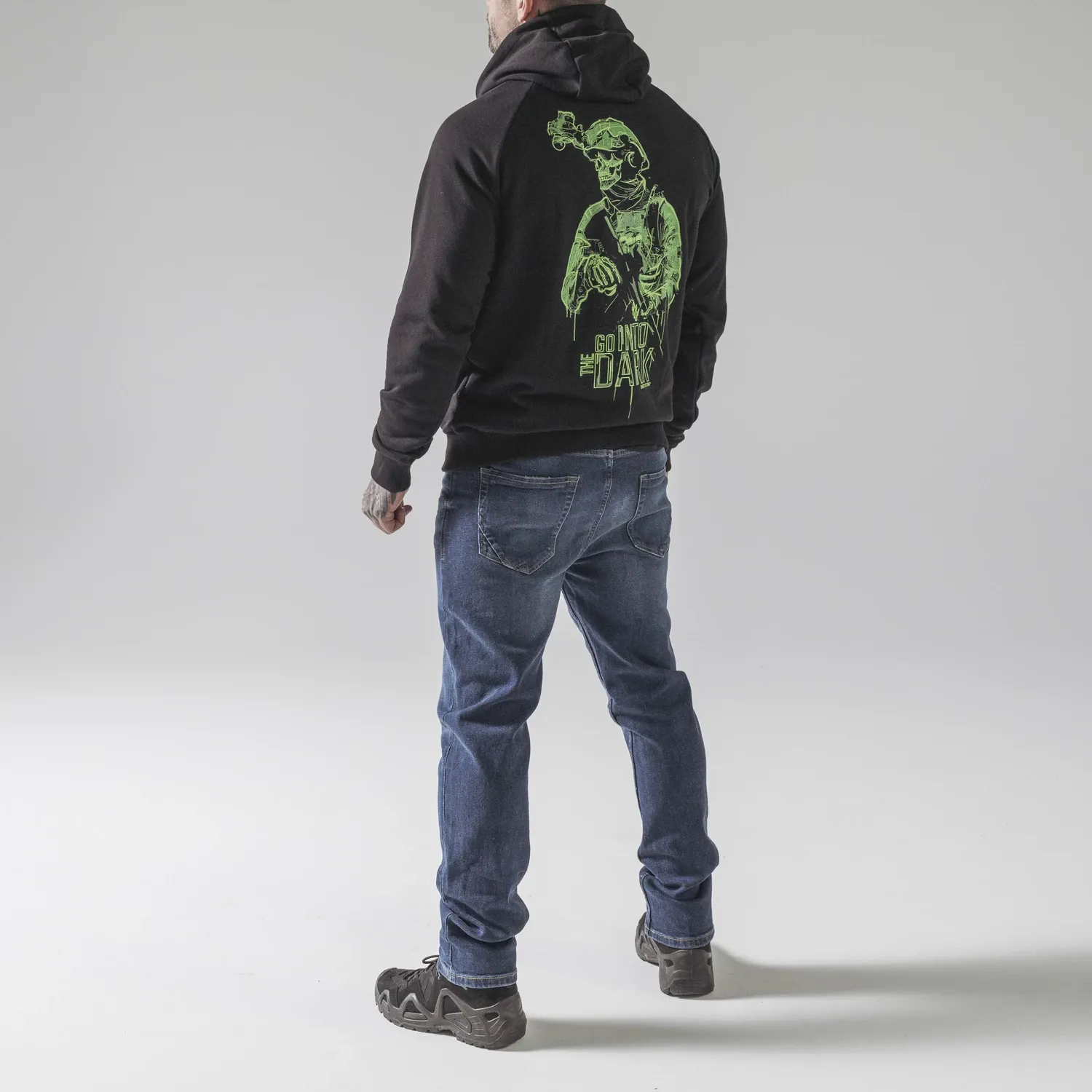 Толстовка с капюшоном в стиле милитари со скелетом на черном фоне.