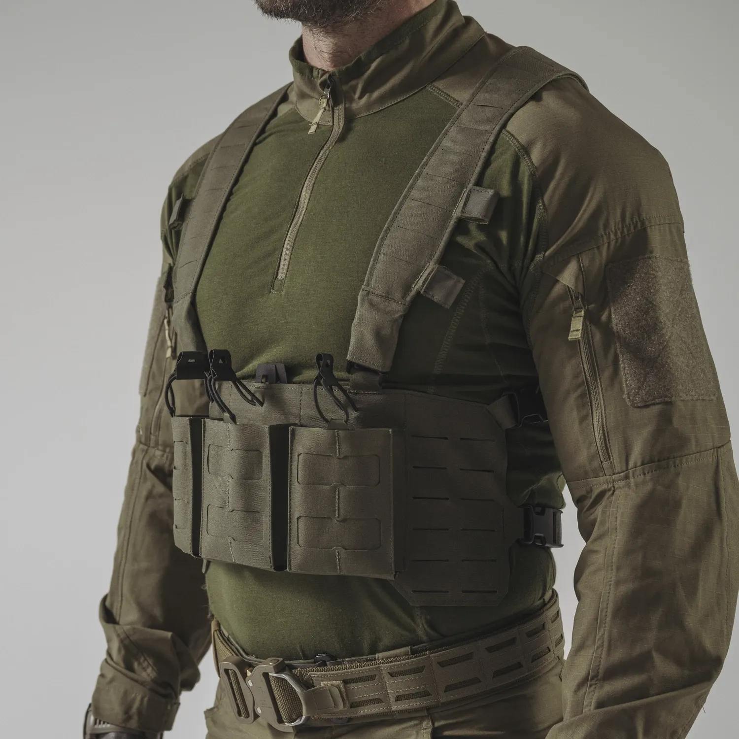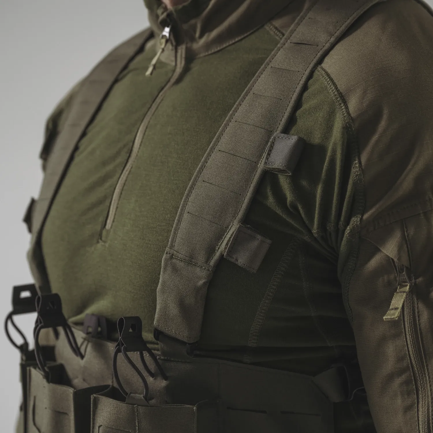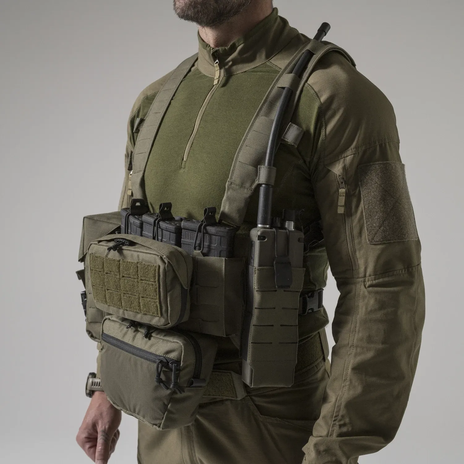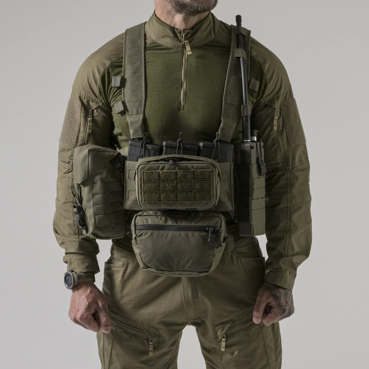 Curtiss® - это гибридное нагрудное устройство с тремя постоянно вшитыми подсумками для системных магазинов HK 308, а также для любого другого магазина .308WIN. Магазины крепятся сверху с помощью эластичных петель-банджи-шнуров. Функциональность нагрудного устройства усиливается боковыми вставками MOLLE PALS, которые позволяют прикреплять дополнительные подсумки, что позволяет настраивать их в соответствии с индивидуальными потребностями. Система крепления также встроена в переднюю часть карманов и в обвязку ремня безопасности, что еще больше повышает конфигурируемость оборудования. Ремень безопасности для переноски был слегка изменен, чтобы лучше распределять нагрузку и повышать комфорт пользователя. Эта модификация увеличивает вместимость снаряжения как по количеству, так и по весу груза, сохраняя при этом максимальный комфорт. Кроме того, в большом внутреннем кармане, закрывающемся на липучку, можно разместить плоские предметы.
