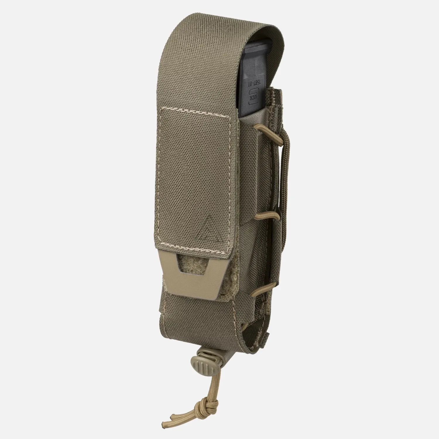 Подсумок предназначен для установки в большинство одно- и двухстворчатых магазинов калибров 9 мм, .40 и .45 мм и позволяет быстро извлекать их с помощью крючка-клапан в виде петли с язычком Hypalon®. Изготовленный из смеси Cordura® и фирменного ламината, он обладает высокой прочностью при минимальном профиле.
