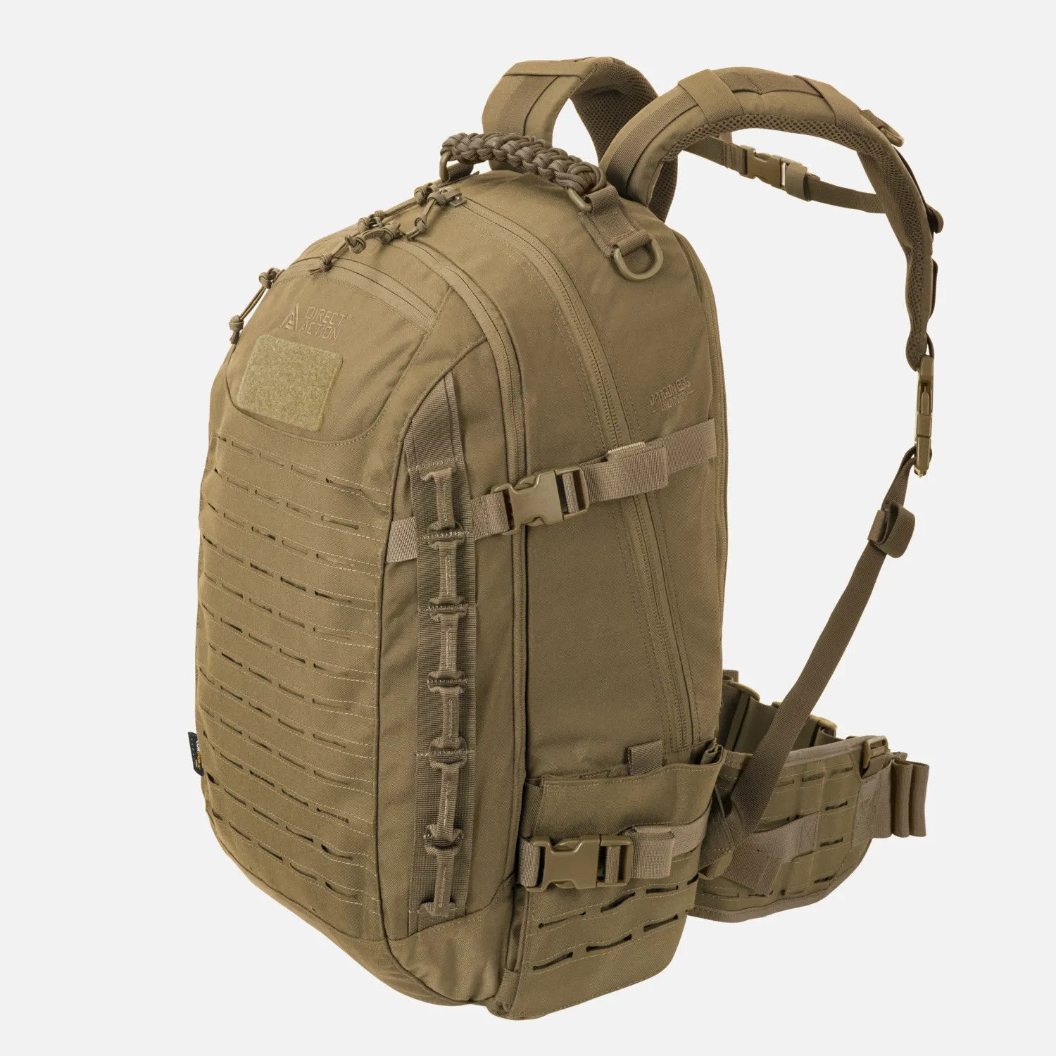 Лазерная резка MOLLE/PALS спереди, по бокам и на набедренном ремне позволяет легко расширять систему без увеличения объема рюкзака. Верхняя ручка для переноски изготовлена из 5,5–метрового паракорда, который можно размотать и использовать в экстренных ситуациях.