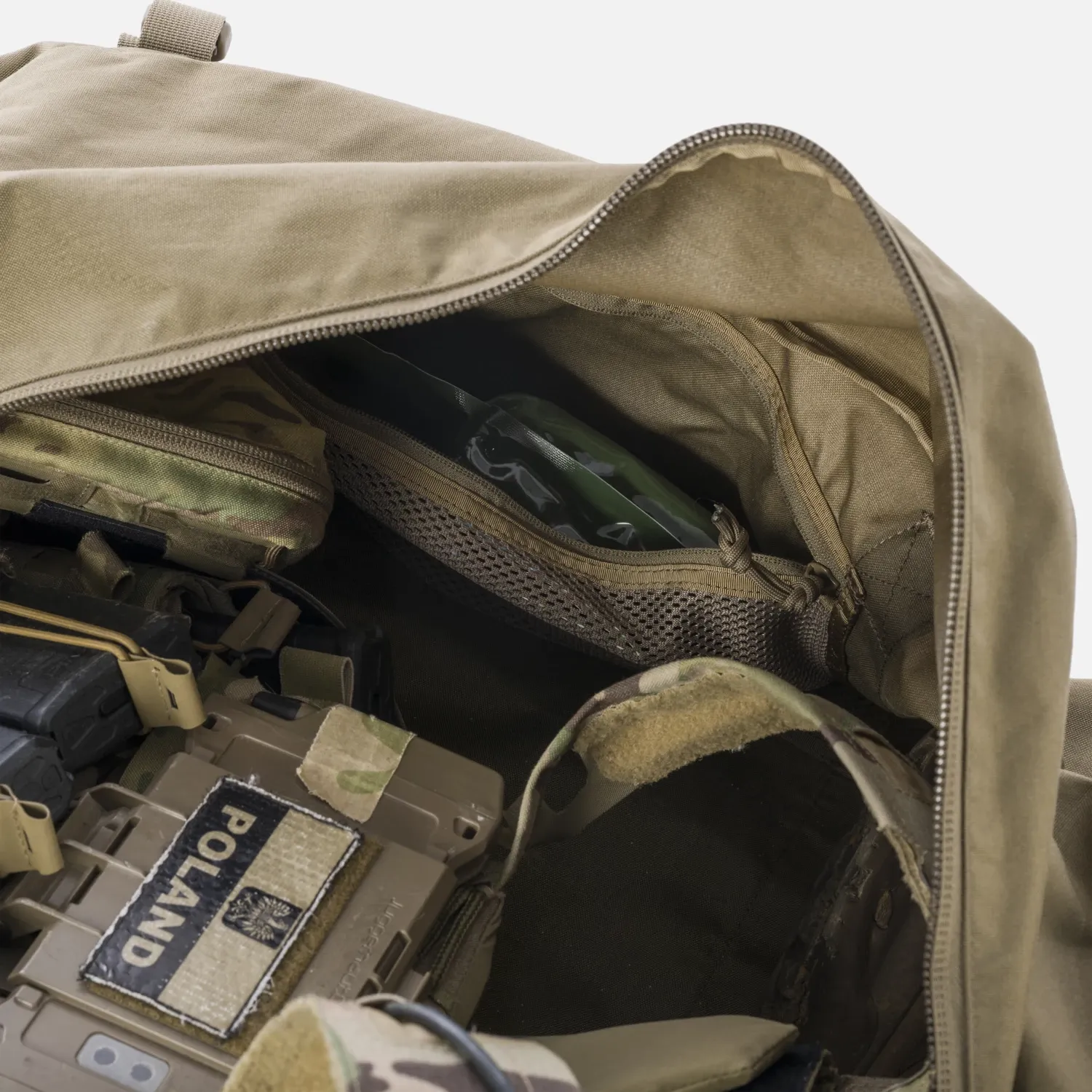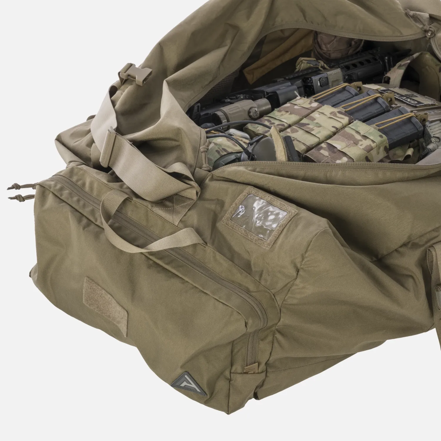Deployment Bag Large изготовлена из прочной ткани Cordura 500D. Благодаря широкому регулируемому плечевому ремню, двум боковым ручкам и двум ленточным ручкам, вшитым по всему дну, сумка рассчитана на большие нагрузки. Она имеет удобную застежку-молнию YKK посередине, два плоских внешних отделения и два отдельных боковых кармана. Внутри основного отделения были вшиты два сетчатых кармана на молнии. Большая сумка для переноски оснащена двумя боковыми панелями с застежкой-липучкой и двумя прозрачными бирками для удобства персонализации.Конструкция сумки Deployment Bag Large мягкая и оснащена компрессионными ремнями для лучшей регулировки.