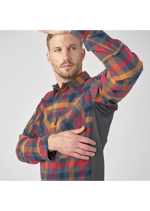 Рубашка изготовлена из инновационной смеси нейлона и полиэстера с волокнами Sorona® от DuPont. Эта ткань не только повышает эластичность и устойчивость к истиранию, но и лучше отводит влагу и приятна на ощупь. Она быстро сохнет, сохраняет форму после стирки и обеспечивает комфорт даже при длительном ношении. Кроме того, ткань обладает антибактериальными свойствами и содержит фильтр UPF50 для эффективной защиты от ультрафиолета.