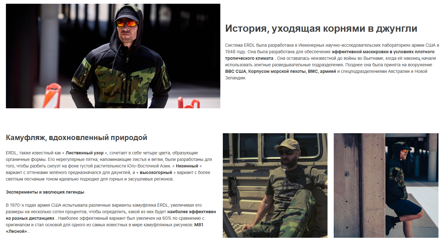 ERDL (его ещё называют «лиственный узор») использует четыре цвета, собранные в органичные, «листоподобные» пятна и линии. Нерегулярные формы разрушают силуэт в густой растительности Юго-Восточной Азии. Существуют разные варианты: «низинный» — с зелёными оттенками для джунглей, и «высокогорный» — с более светлыми, «песчаными» тонами для гор и засушливых районов. Проще говоря — маскирует так, будто ты и есть куст (но это, конечно, метафора).