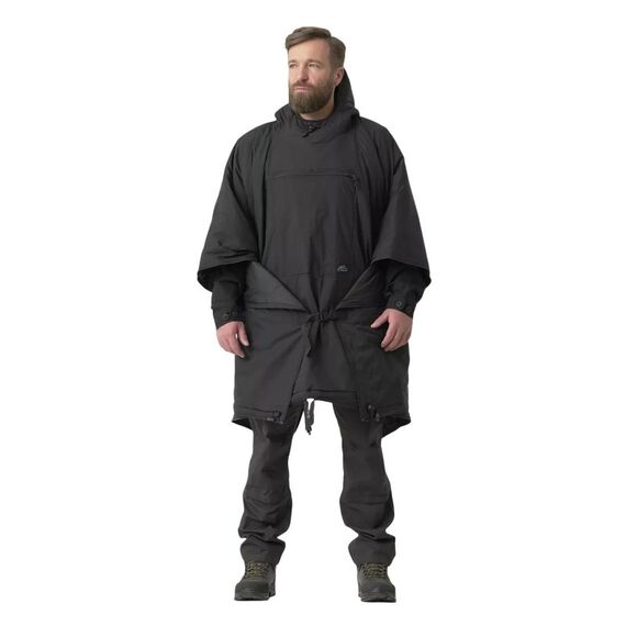 Самое очевидное и простое применение Swagman Roll® — в качестве пончо. На талии есть эластичные ленты, которые, будучи застегнутыми, плотно прилегают к телу, напоминая импровизированную куртку-анорак с большим передним карманом. Оно защищает от холода благодаря современной изоляции Climashield® Apex™ весом 67 г/м², которая сохраняет тепло даже во влажном состоянии. В сочетании с нашим пончо модели US Swagman образует двухслойную конструкцию: внутренний слой обеспечивает тепло, а внешний — защиту от дождя.
